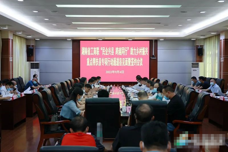 9月4日,省工商联“民企兴县 跨越同行”助力乡村振兴重点县专项行动通道县见面暨签约会在县政府会议中心召开。在省工商联推动下,10余家湖南民营企业与我县签订帮扶框架协议。