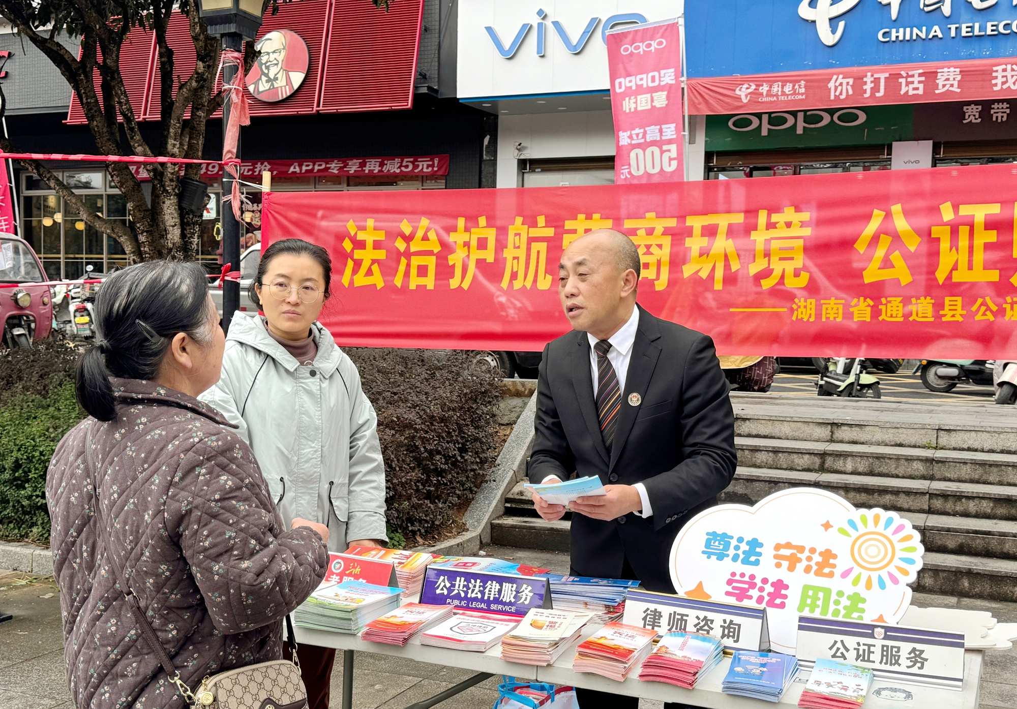 为深入学习贯彻习近平新时代中国特色社会主义思想,全面落实党的二十大精神和习近平法治思想,严格践行“谁主管谁普法、谁执法谁普法、谁服务谁普法”普法责任制,2月28日,通道侗族自治县公证处围绕 “法治护航营商环境 公证赋能企业前行”主题开展公证法治宣传服务活动,将专业法律服务送到企业和群众身边,以法治力量为县域法治化营商环境优化赋能。