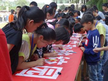 学生争相在横幅上签名