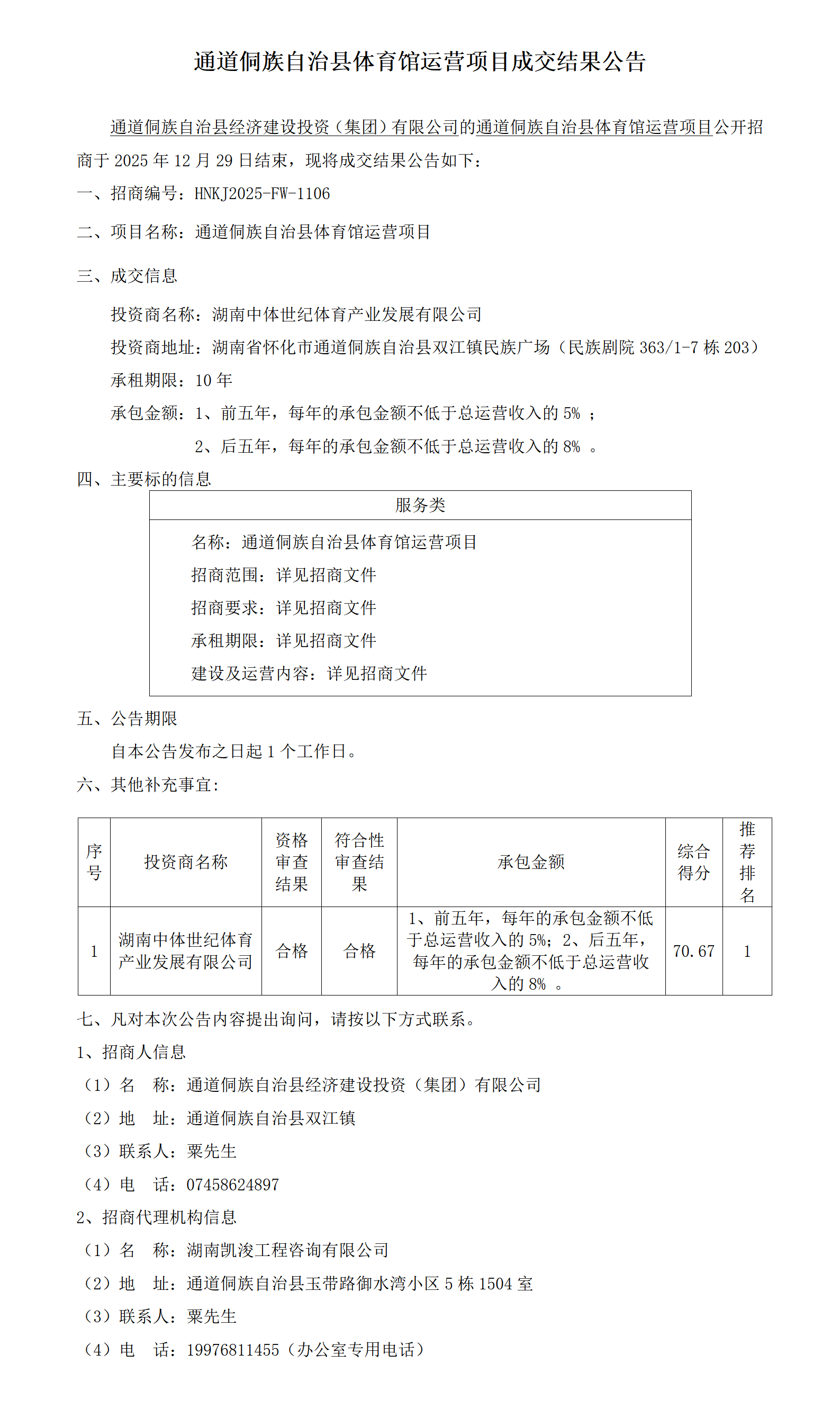 通道侗族自治县体育馆运营项目成交结果公告