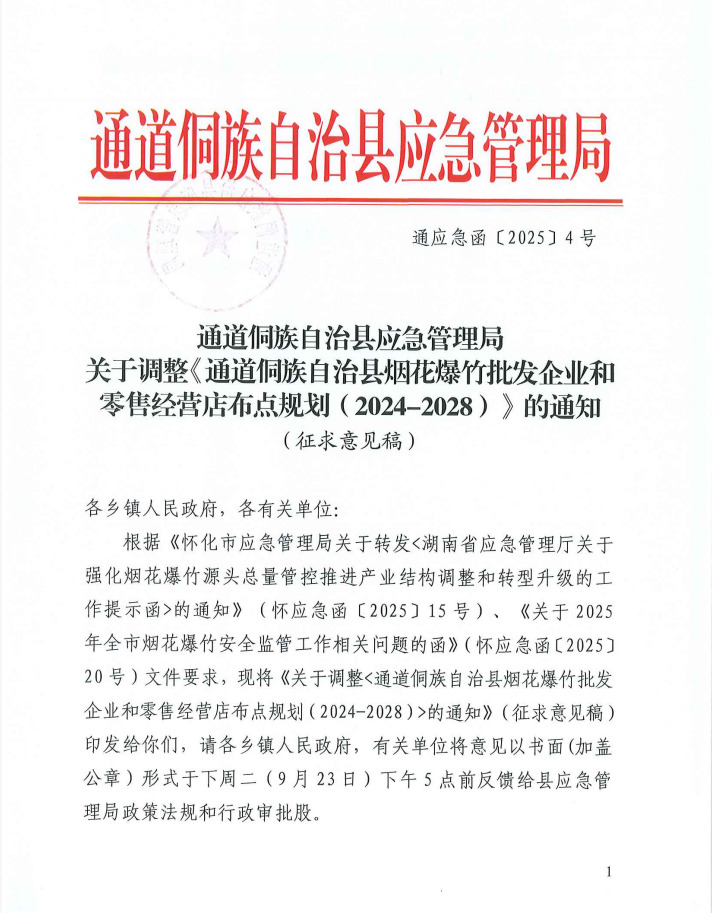 通道侗族自治县应急管理局关于调整《通道侗族自治县烟花爆竹批发企业和零售经营店布点规划(2024-2028)》的通知(征求意见稿)