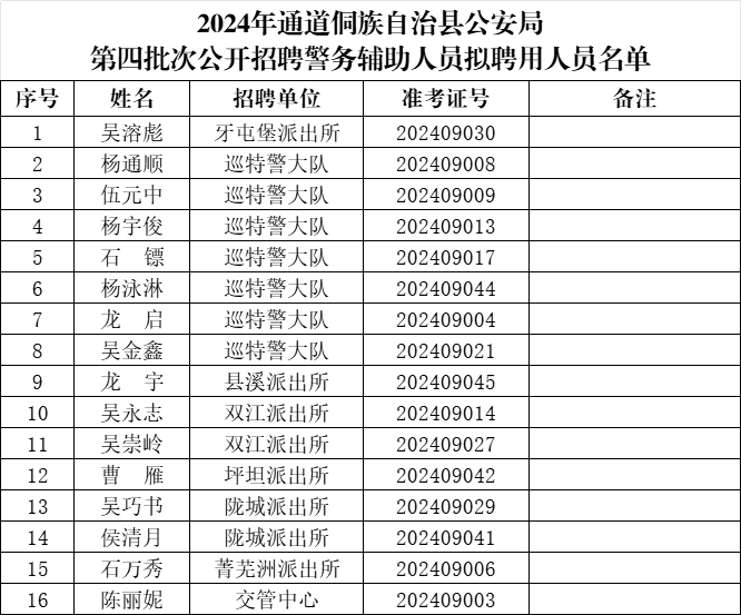 通道侗族自治县公安局2024年第四次公开招聘警务辅助人员拟聘用人员名单