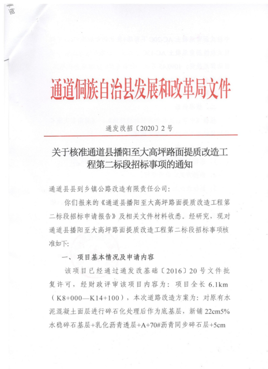 关于核准通道县播阳至大高坪路面提质改造工程第二标段招标事项的通知