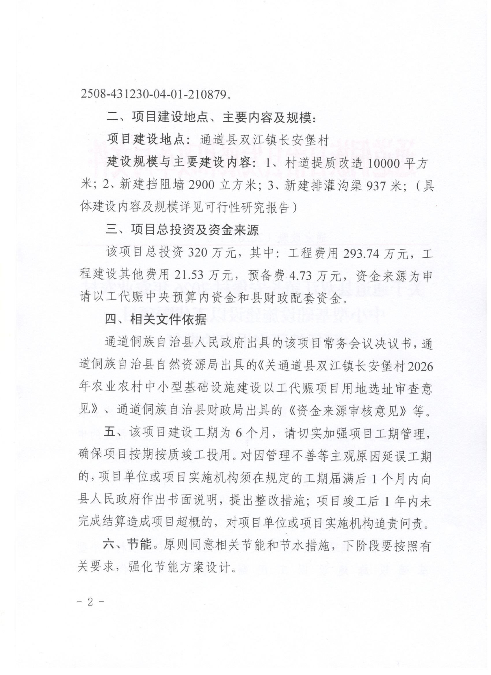 关于通道县双江镇长安堡村2026年农业农村中小型基础设施建设以工代赈项目可行性研究报告的批复
