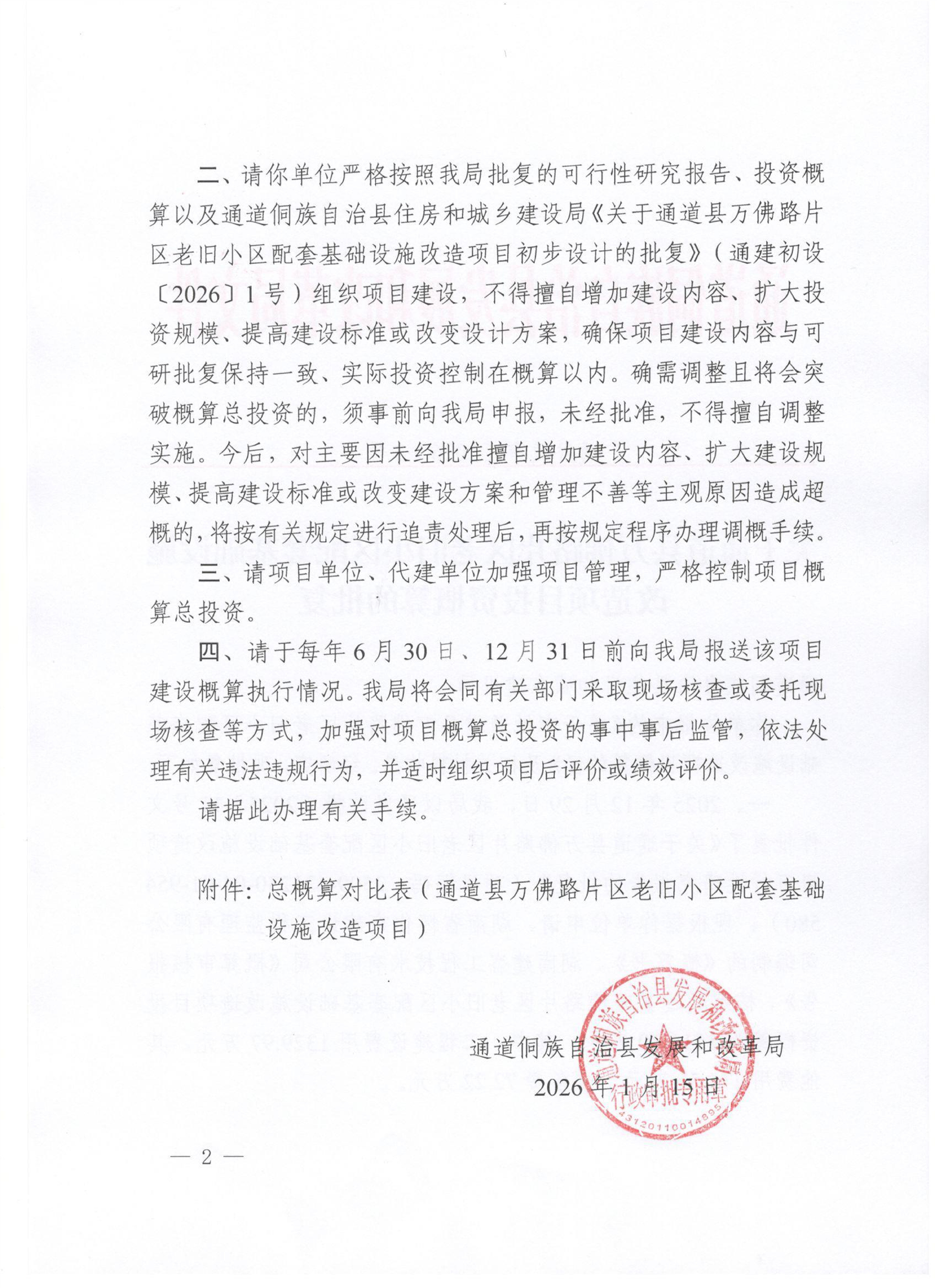 关于通道县万佛路片区老旧小区配套基础设施改造项目投资概算的批复