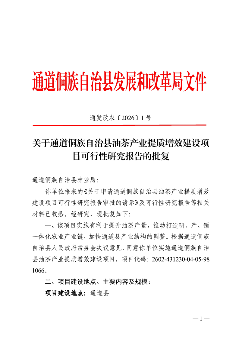关于通道侗族自治县油茶产业提质增效建设项目可行性研究报告的批复