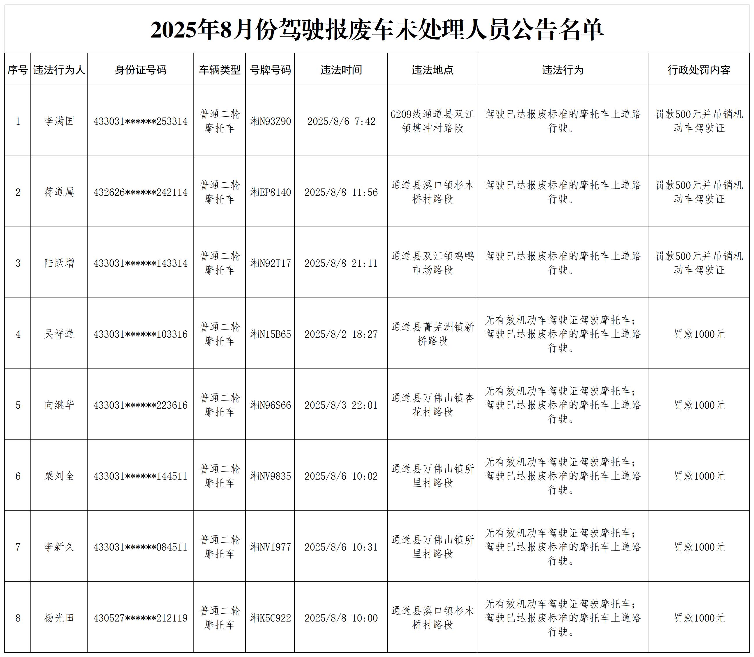 下列道路交通违法行为人实施驾驶拼装或者达到报废标准的机动车上道路行驶的等道路交通安全违法行为,其行为违反了《中华人民共和国道路交通安全法》第14条第1款、第3款等规定,依据《中华人民共和国道路交通安全法》第100条第1款、第2款等,《湖南省实施<中华人民共和国道路交通安全法>办法》第61条第7项等规定,依法应当给予吊销机动车驾驶证并罚款、罚款的行政处罚,已经超过15日未到我大队接受处理。经我大队依法邮寄告知书期满后,道路交通违法行为人已经在30日内未到我大队接受处理(附名单及交通违法的事实等相关内容)。现依据《湖南省实施<中华人民共和国道路交通安全法>办法》第46条、《公安机关办理行政案件程序规定》第168条之规定,我大队依法予以公告,公告期为7日。在公告期内道路交通违法行为人可以到我大队提出陈述和申辩、听证的要求。公告期满未提出陈述和申辩、听证要求的,我大队将依法作出行政处罚决定。