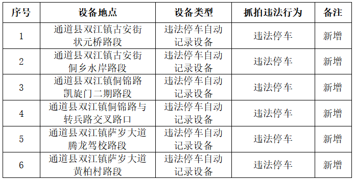 为优化我县道路交通秩序,预防和减少道路交通事故发生,确保交通出行环境安全、有序、畅通。根据《中华人民共和国道路交通安全法》、公安部《道路交通安全违法行为处理程序规定》等法律法规,我大队将在城区新增一批技术监控设备,用于抓拍道路交通违法行为。现将抓拍点位公示如下:
