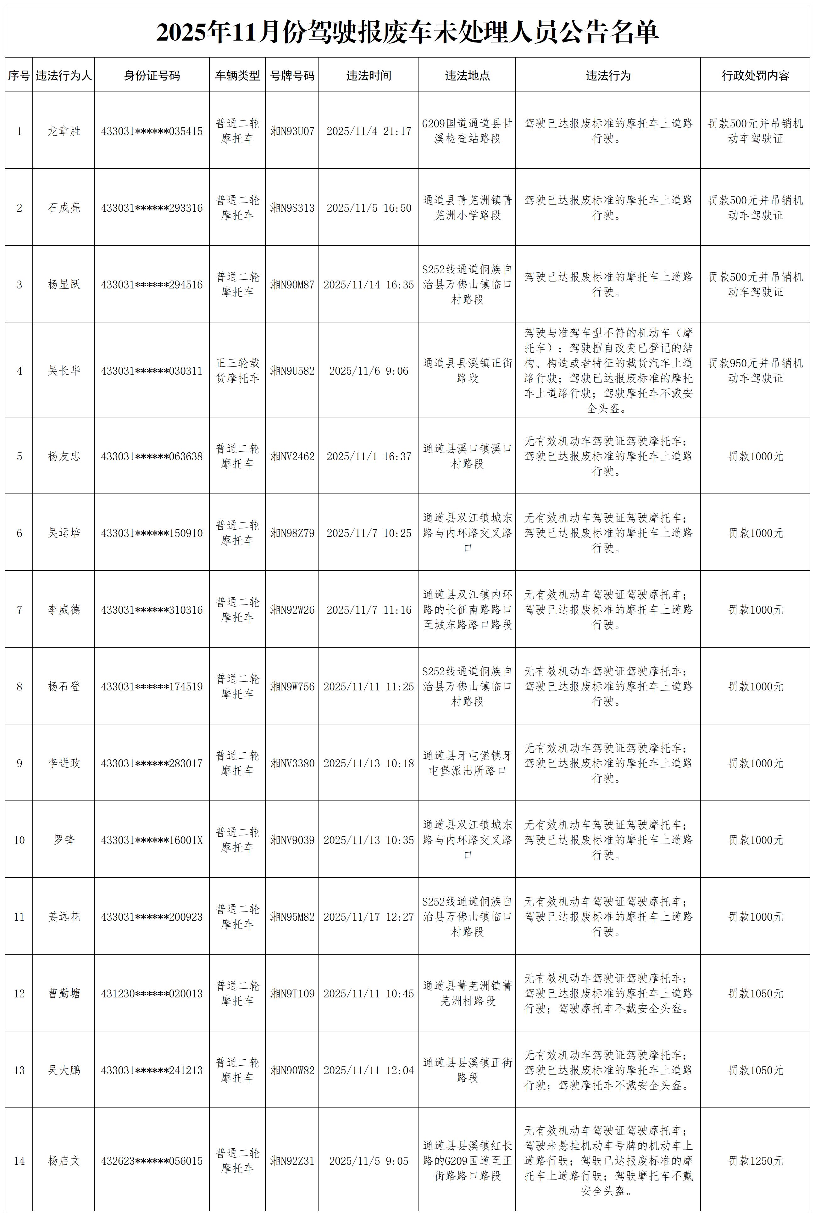 下列道路交通违法行为人实施驾驶拼装或者达到报废标准的机动车上道路行驶的等道路交通安全违法行为,其行为违反了《中华人民共和国道路交通安全法》第14条第1款、第3款等规定,依据《中华人民共和国道路交通安全法》第100条第1款、第2款等,《湖南省实施<中华人民共和国道路交通安全法>办法》第61条第7项等规定,依法应当给予吊销机动车驾驶证并罚款、罚款的行政处罚,已经超过15日未到我大队接受处理。经我大队依法邮寄告知书期满后,道路交通违法行为人已经在30日内未到我大队接受处理(附名单及交通违法的事实等相关内容)。现依据《湖南省实施<中华人民共和国道路交通安全法>办法》第46条、《公安机关办理行政案件程序规定》第168条之规定,我大队依法予以公告,公告期为7日。在公告期内道路交通违法行为人可以到我大队提出陈述和申辩、听证的要求。公告期满未提出陈述和申辩、听证要求的,我大队将依法作出行政处罚决定。