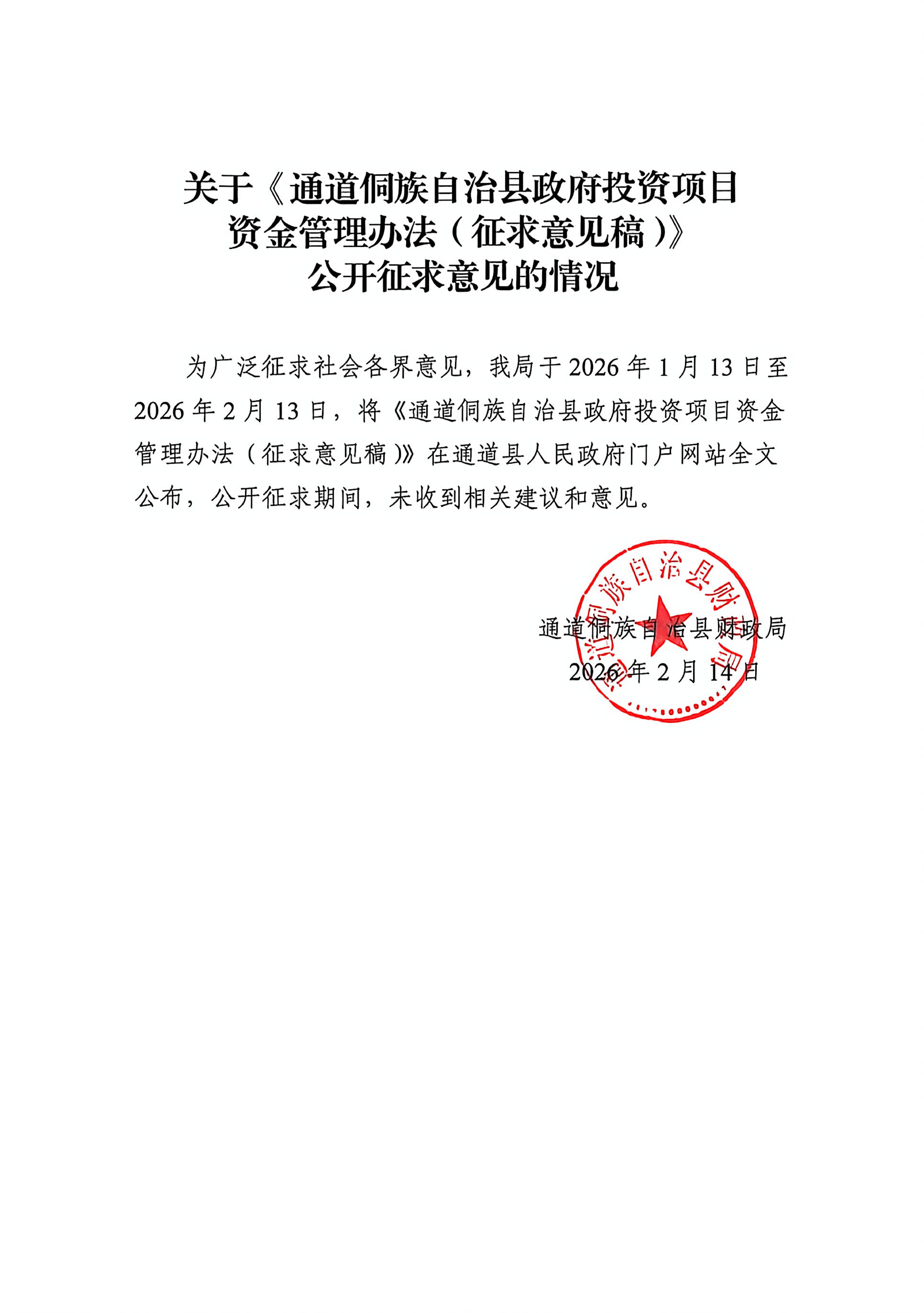 关于《通道侗族自治县政府投资项目资金管理办法(征求意见稿)》公开征求意见的情况