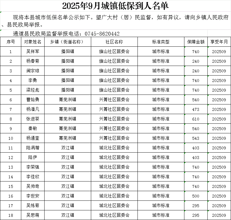 2025年9月城市低保到人名单