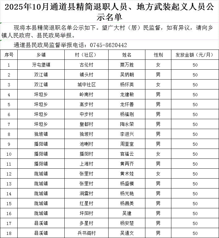 2025年10月通道县精简退职人员、地方武装起义人员公示名单
