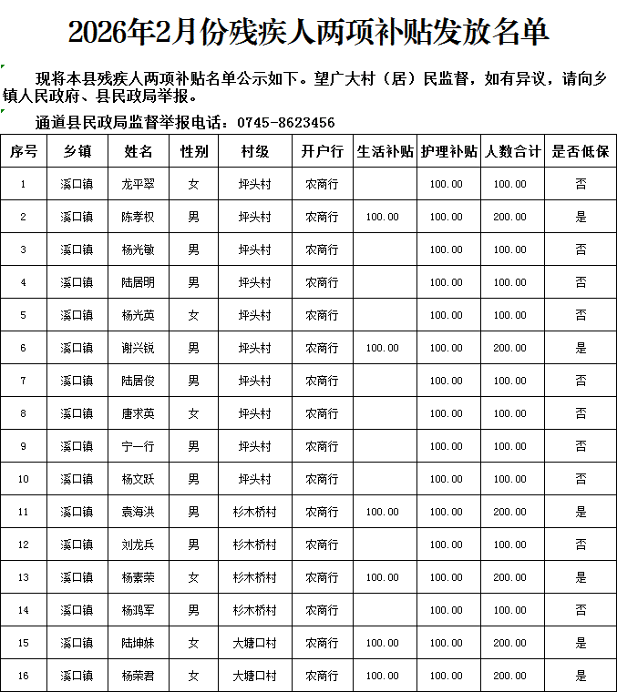 2026年2月份残疾人两项补贴发放名单