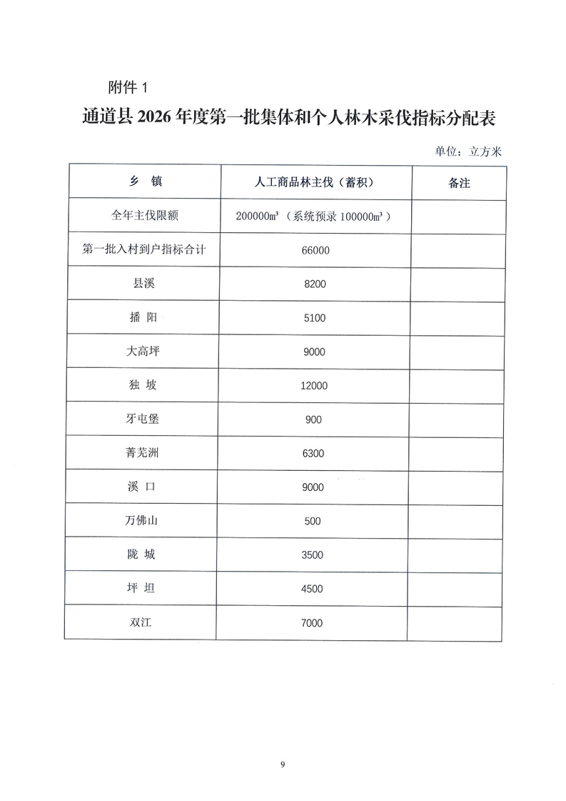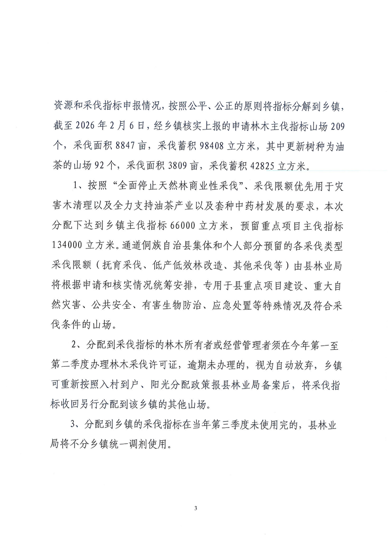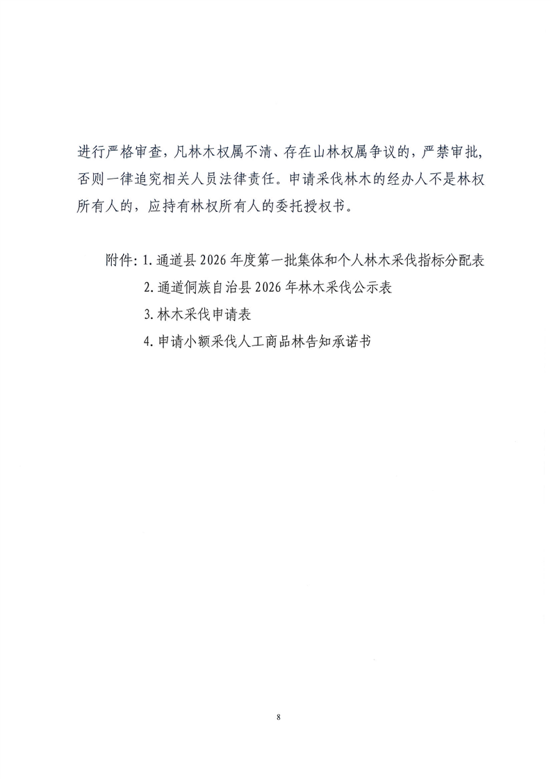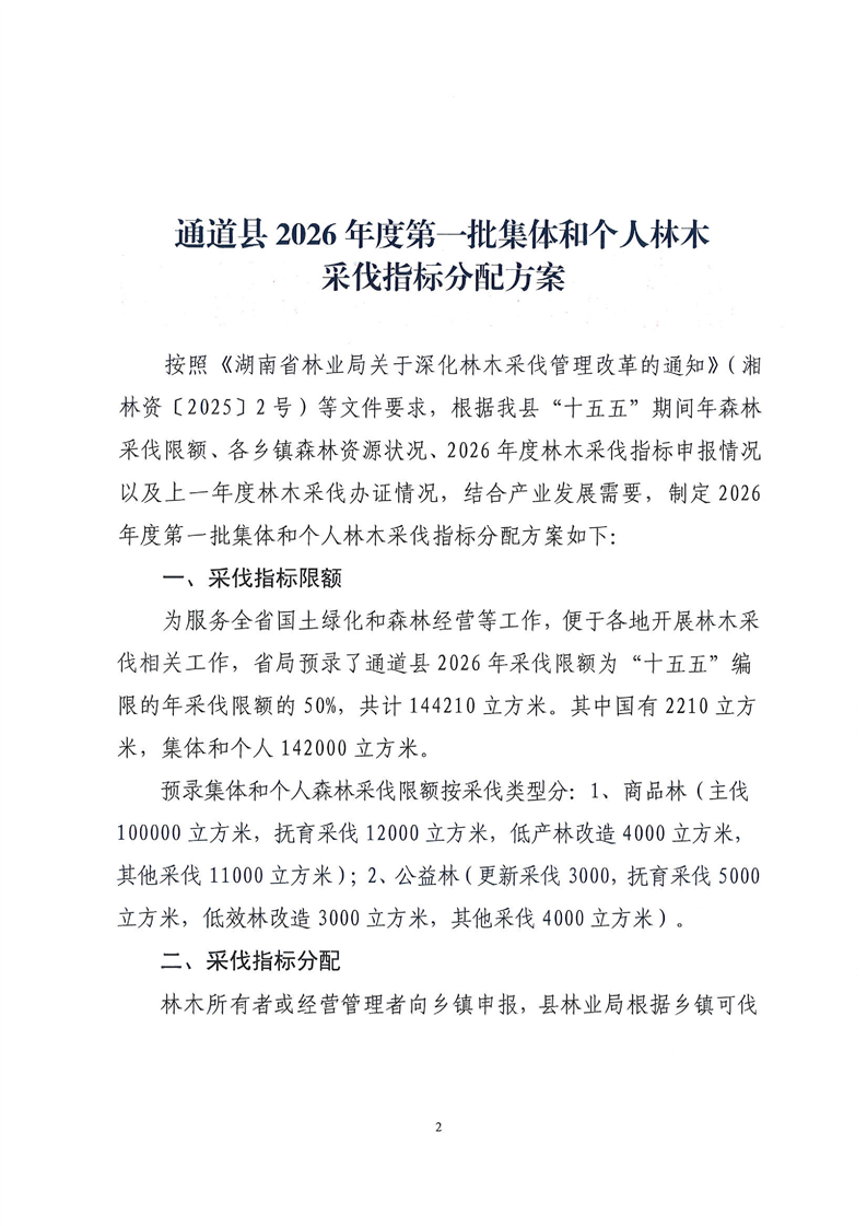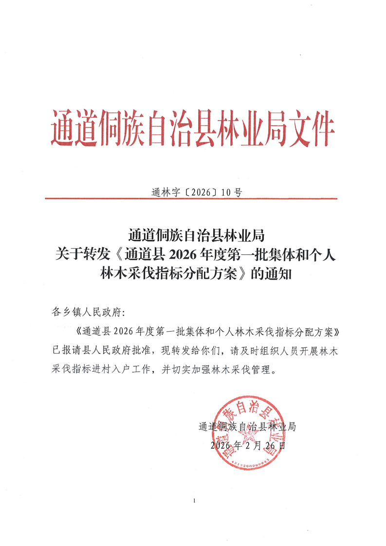 通道侗族自治县林业局关于转发《通道县2026年度第一批集体和个人林木采伐指标分配方案》的通知
