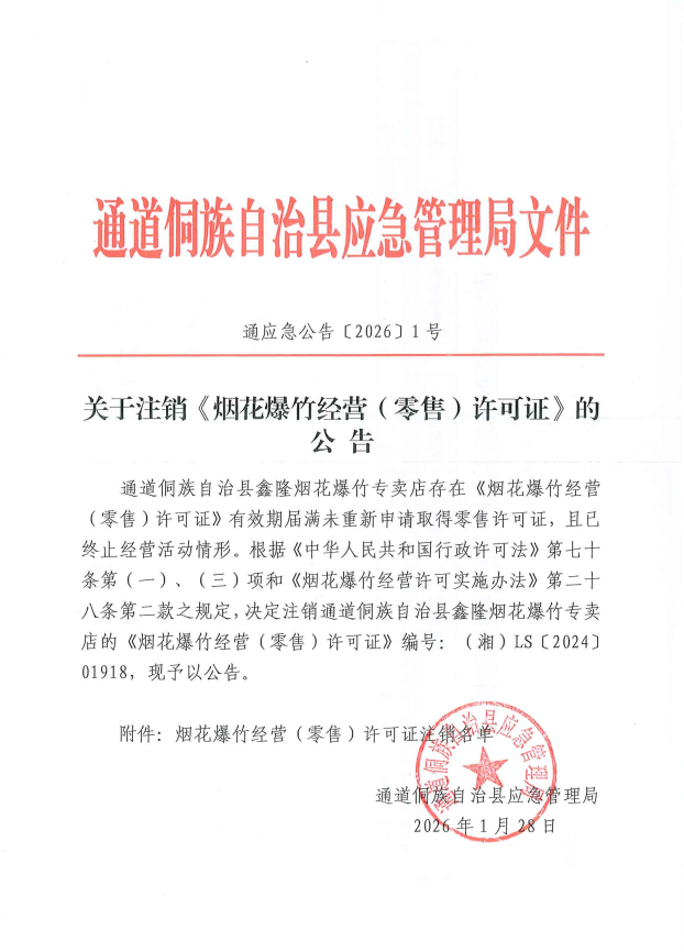 关于注销《烟花爆竹经营(零售)许可证》的公告 通应急公告〔2026〕1号