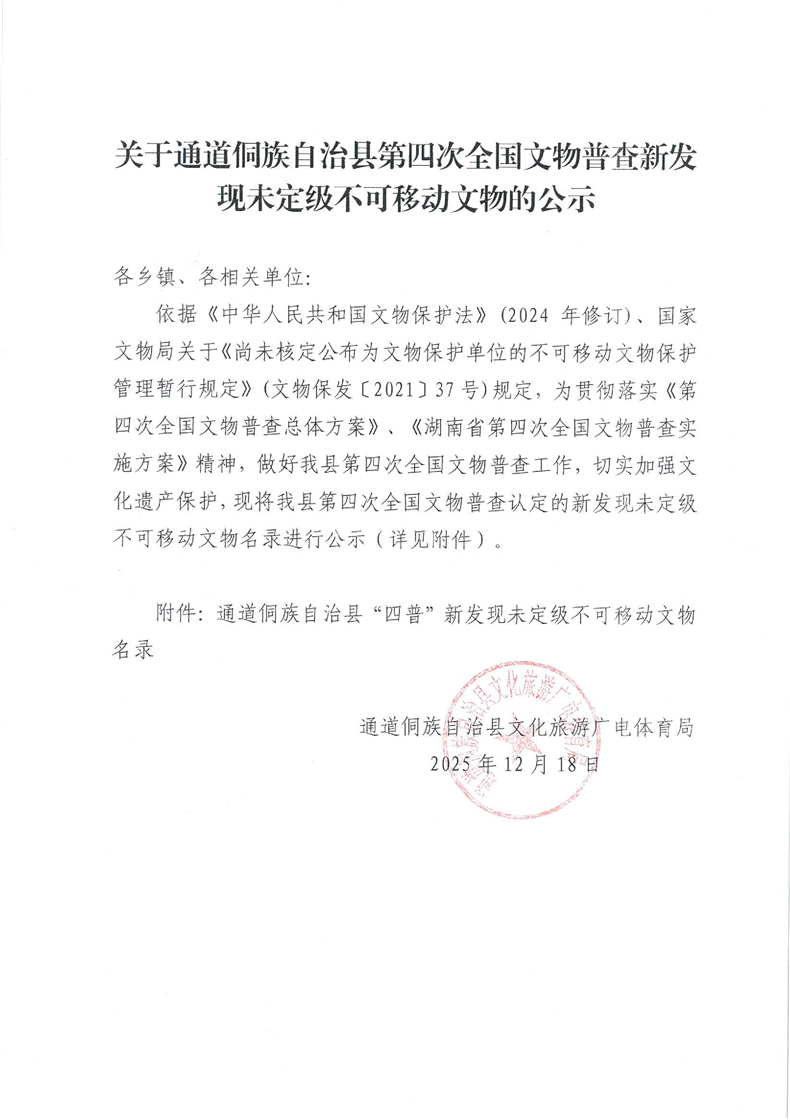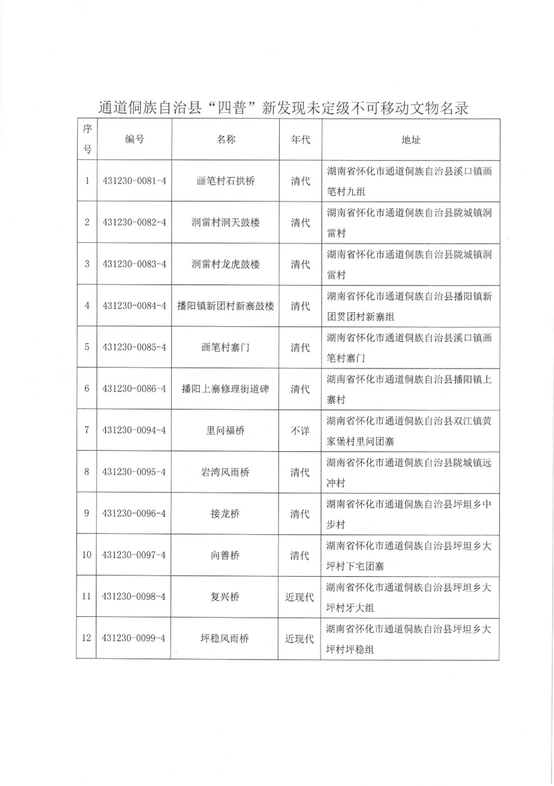 关于通道侗族自治县第四次全国文物普查新发现未定级不可移动文物的公示