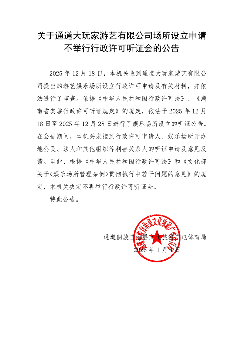 关于通道大玩家游艺有限公司场所设立申请不举行行政许可听证会的公告