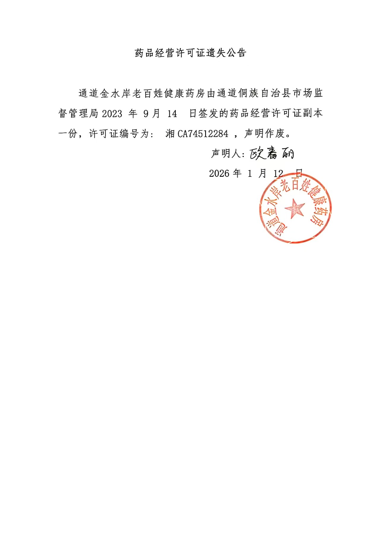 药品经营许可证遗失公告