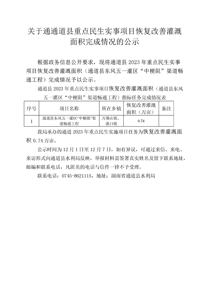 关于通通道县重点民生实事项目恢复改善灌溉面积完成情况的公示