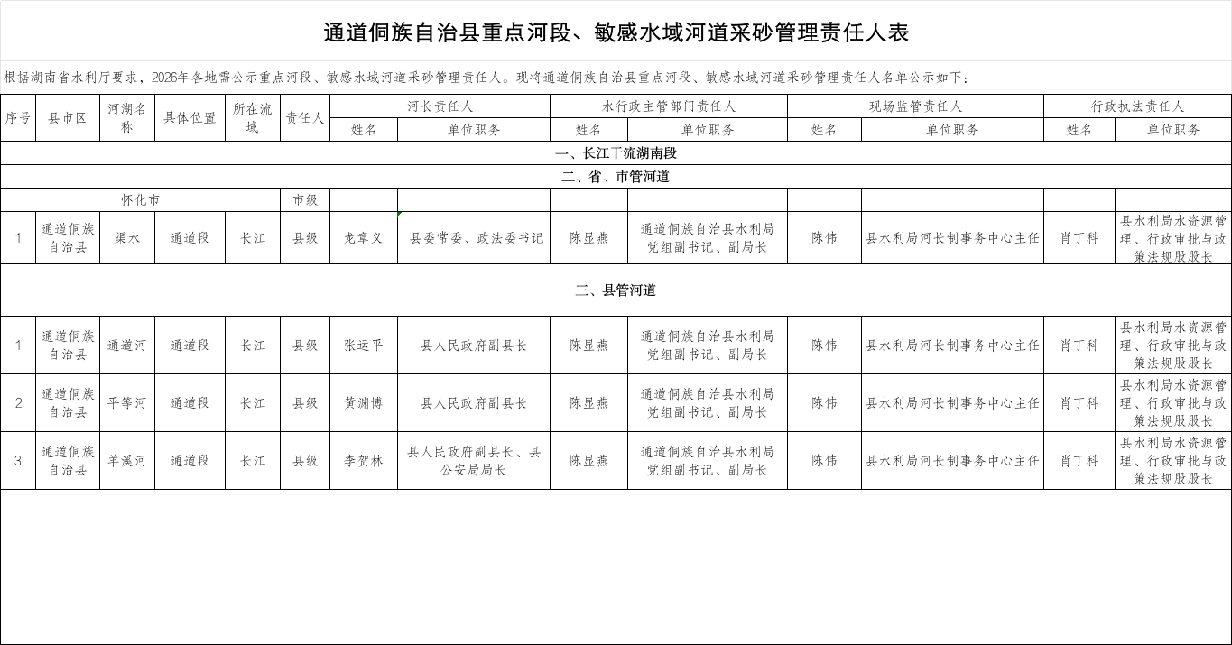 通道侗族自治县重点河段、敏感水域河道采砂管理责任人表