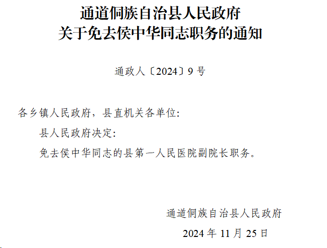 通道侗族自治县人民政府关于免去侯中华同志职务的通知