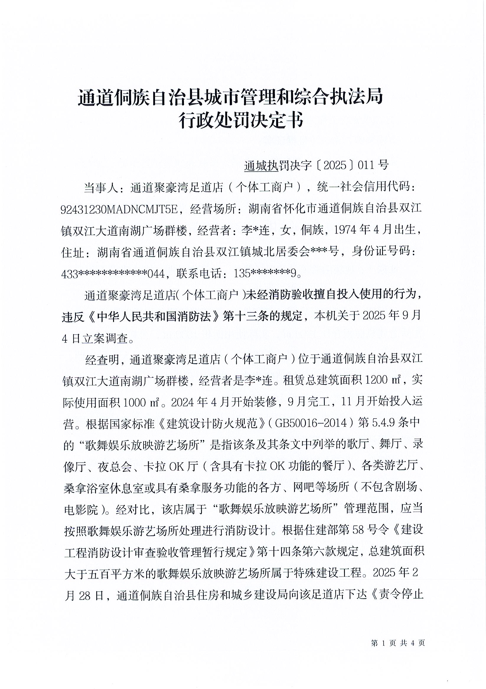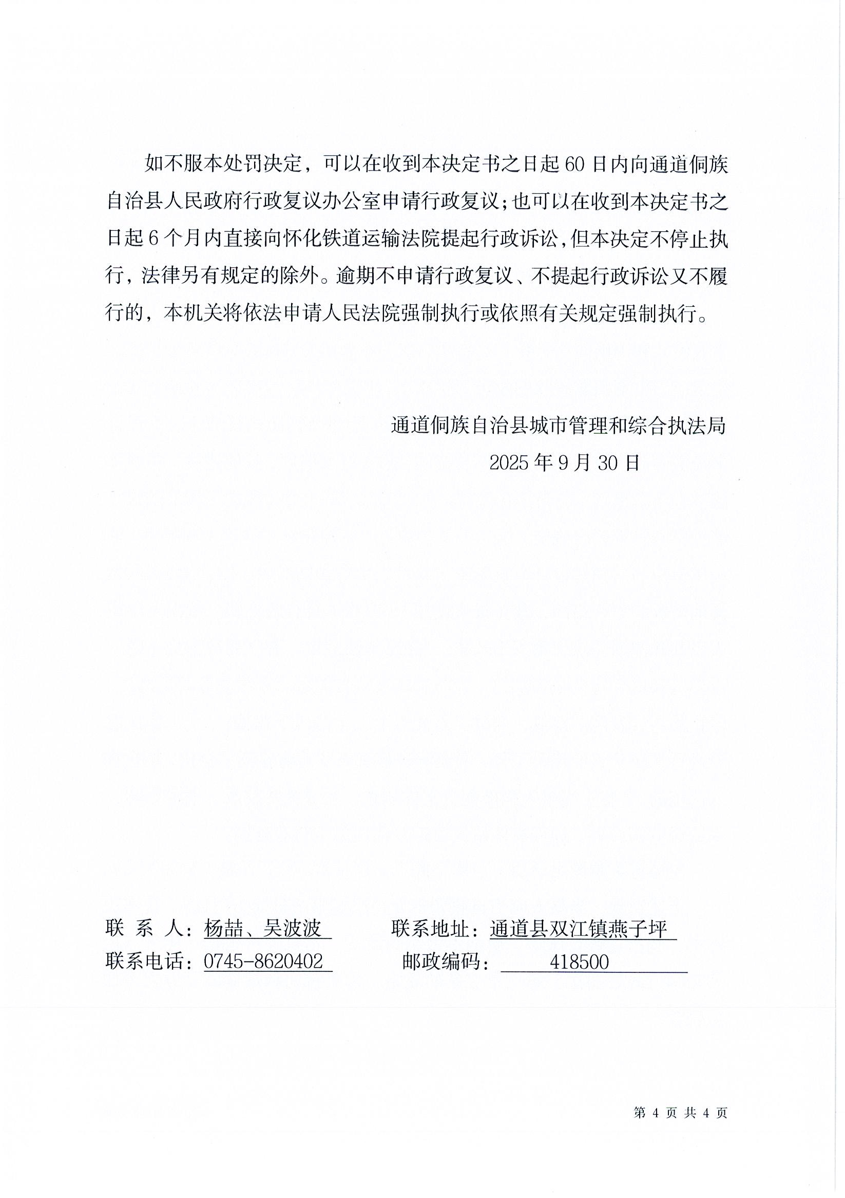 通道侗族自治县城市管理和综合执法局行政处罚决定书 通城执 罚决字〔2025〕011 号