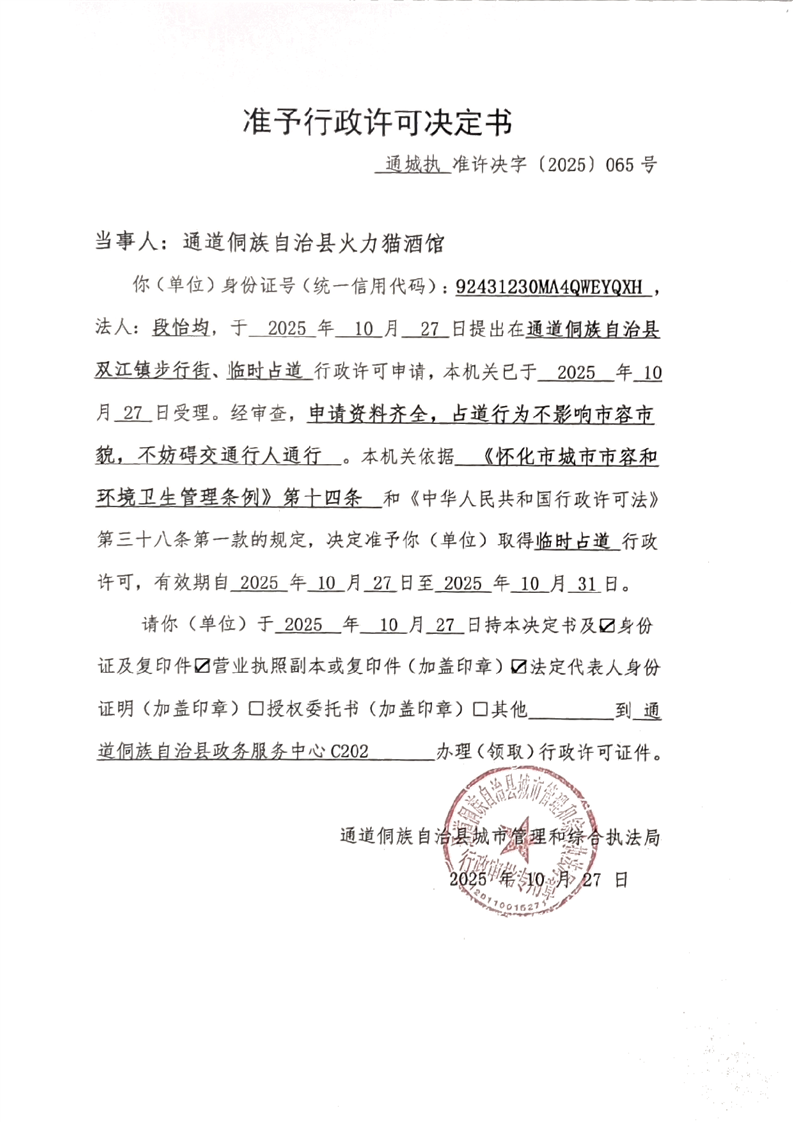 通道侗族自治县城市管理和综合执法局行政许可决定书 通道城执许2025第065号