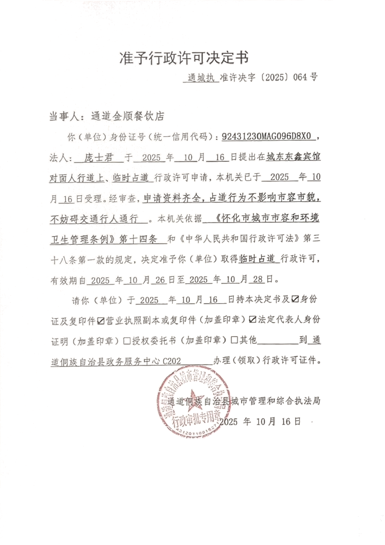 通道侗族自治县城市管理和综合执法局行政许可决定书 通道城执许2025第064号