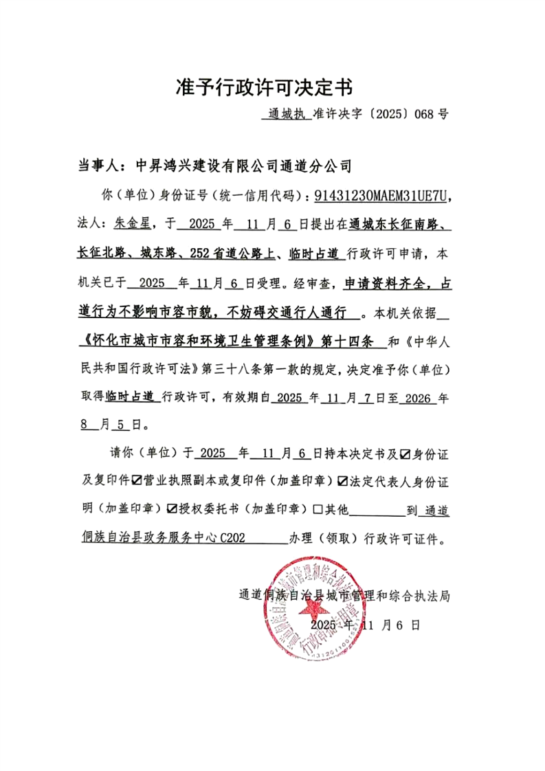 通道侗族自治县城市管理和综合执法局行政许可决定书 通道城执许2025第068号