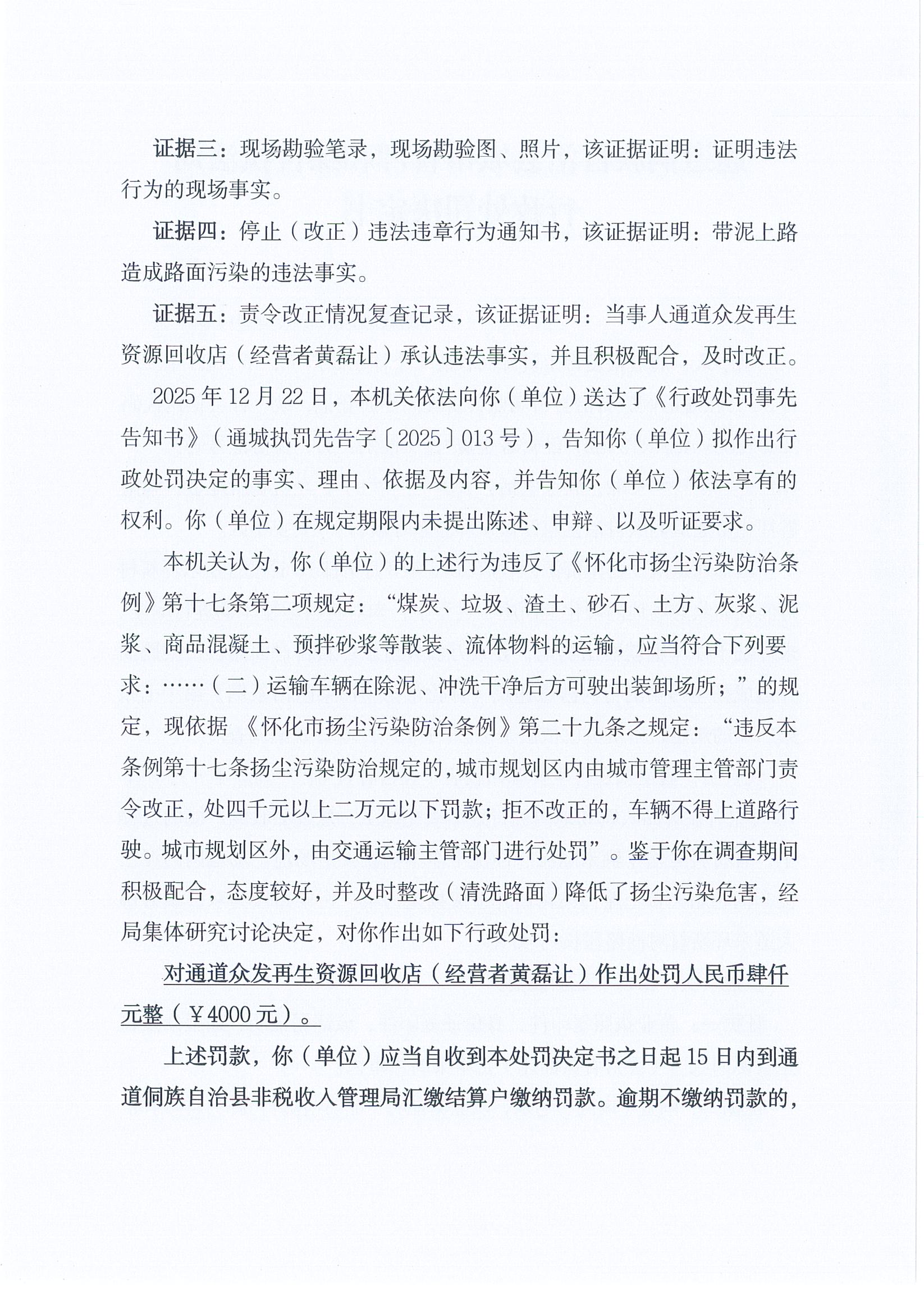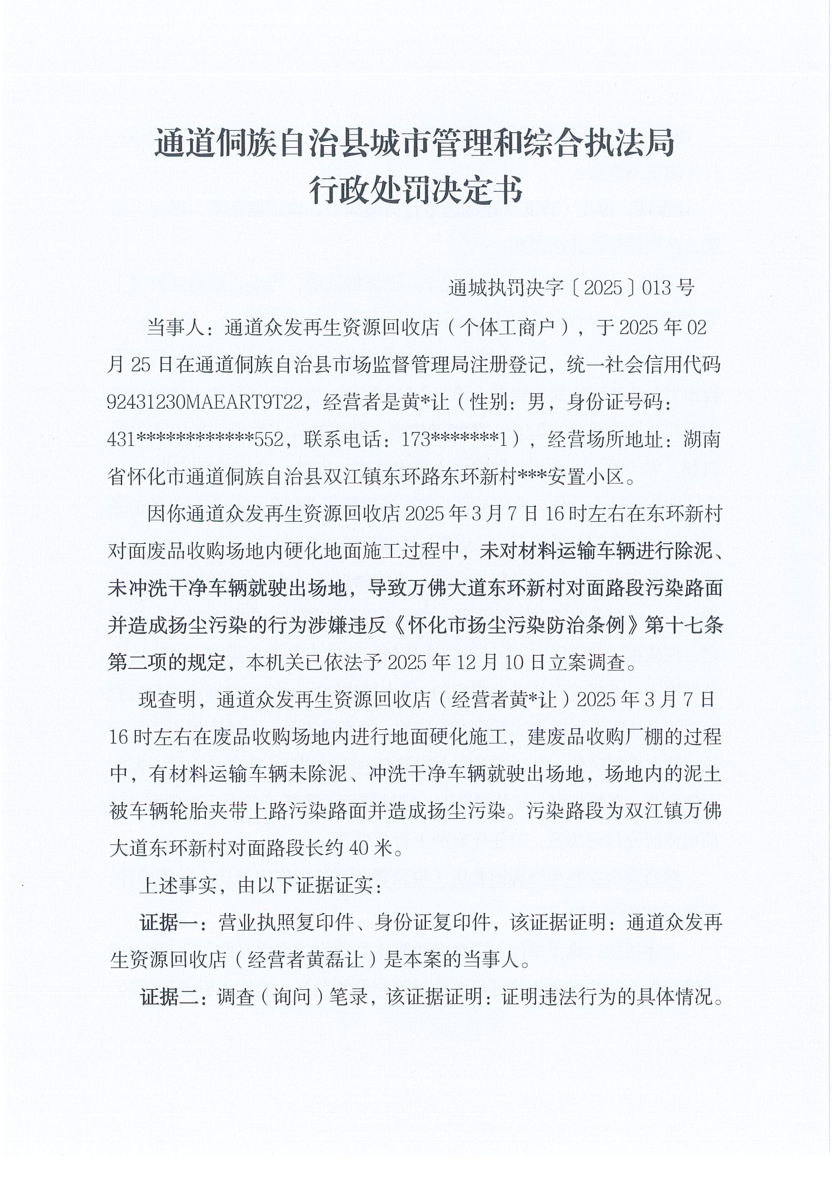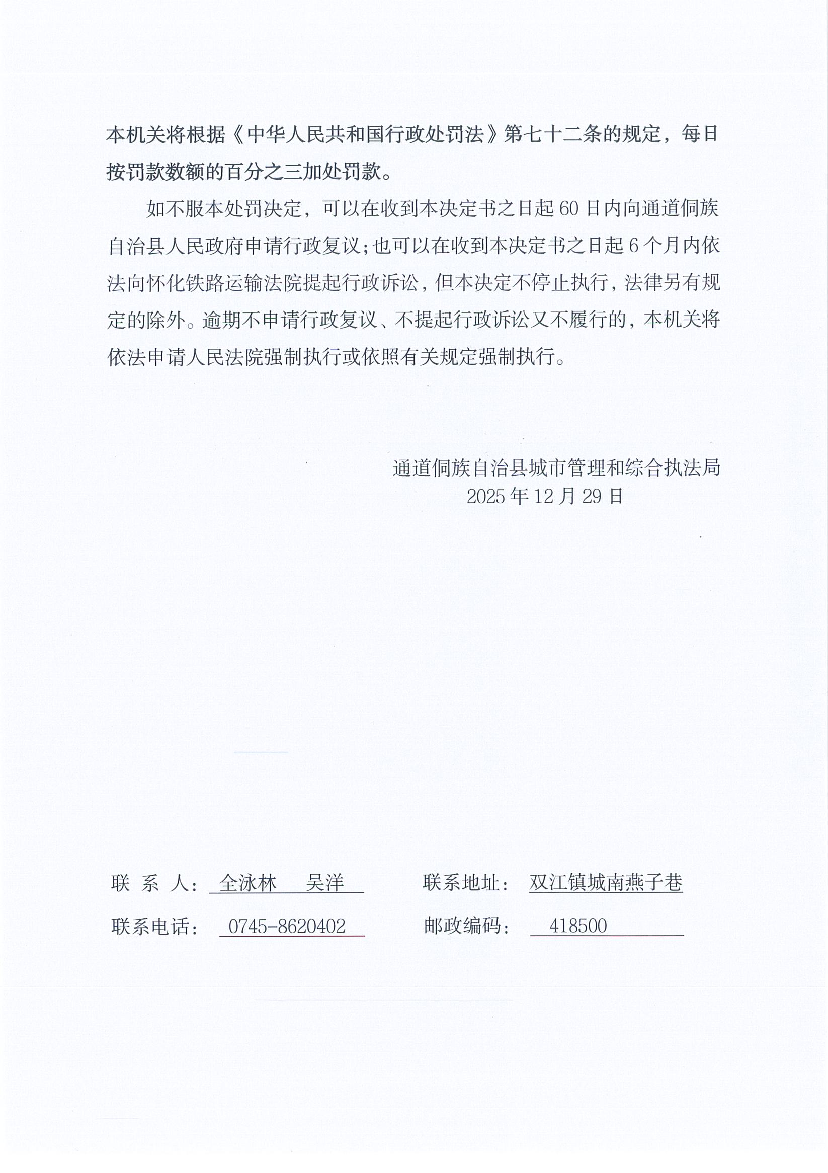 通道侗族自治县城市管理和综合执法局行政处罚决定书 通城执罚决字〔2025〕013号