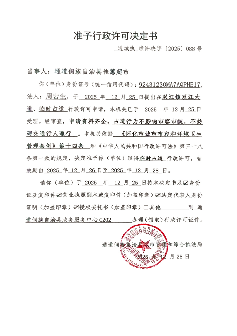 通道侗族自治县城市管理和综合执法局行政许可决定书 通道城执许2025第088号