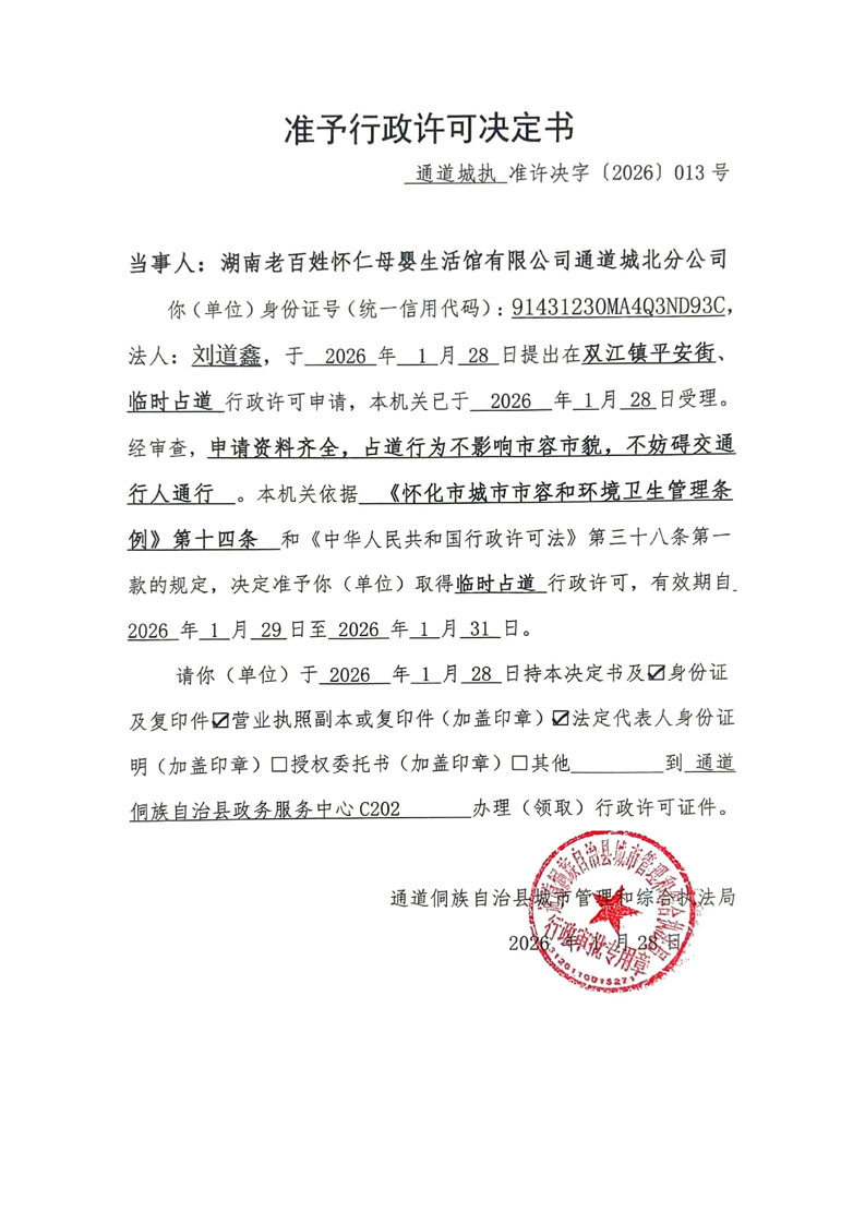 通道侗族自治县城市管理和综合执法局行政许可决定书 通道城执许2026第013号