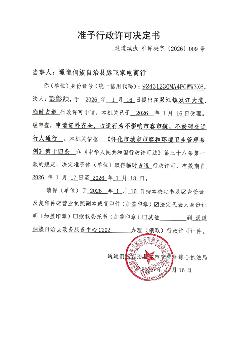 通道侗族自治县城市管理和综合执法局行政许可决定书 通道城执许2026第009号