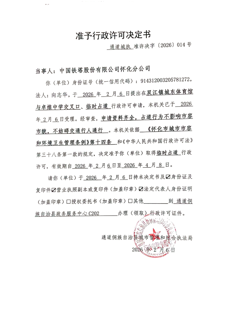 通道侗族自治县城市管理和综合执法局行政许可决定书 通道城执许2026第014号