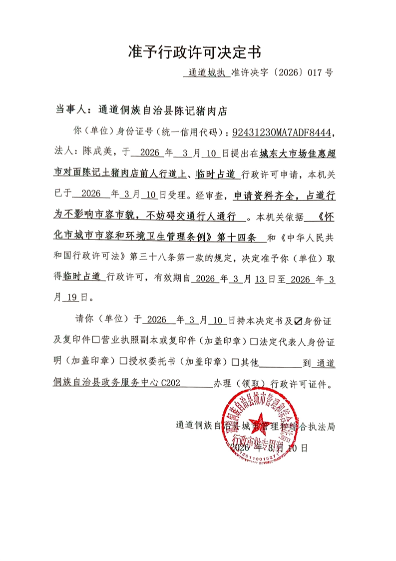 通道侗族自治县城市管理和综合执法局行政许可决定书 通道城执许2026第017号