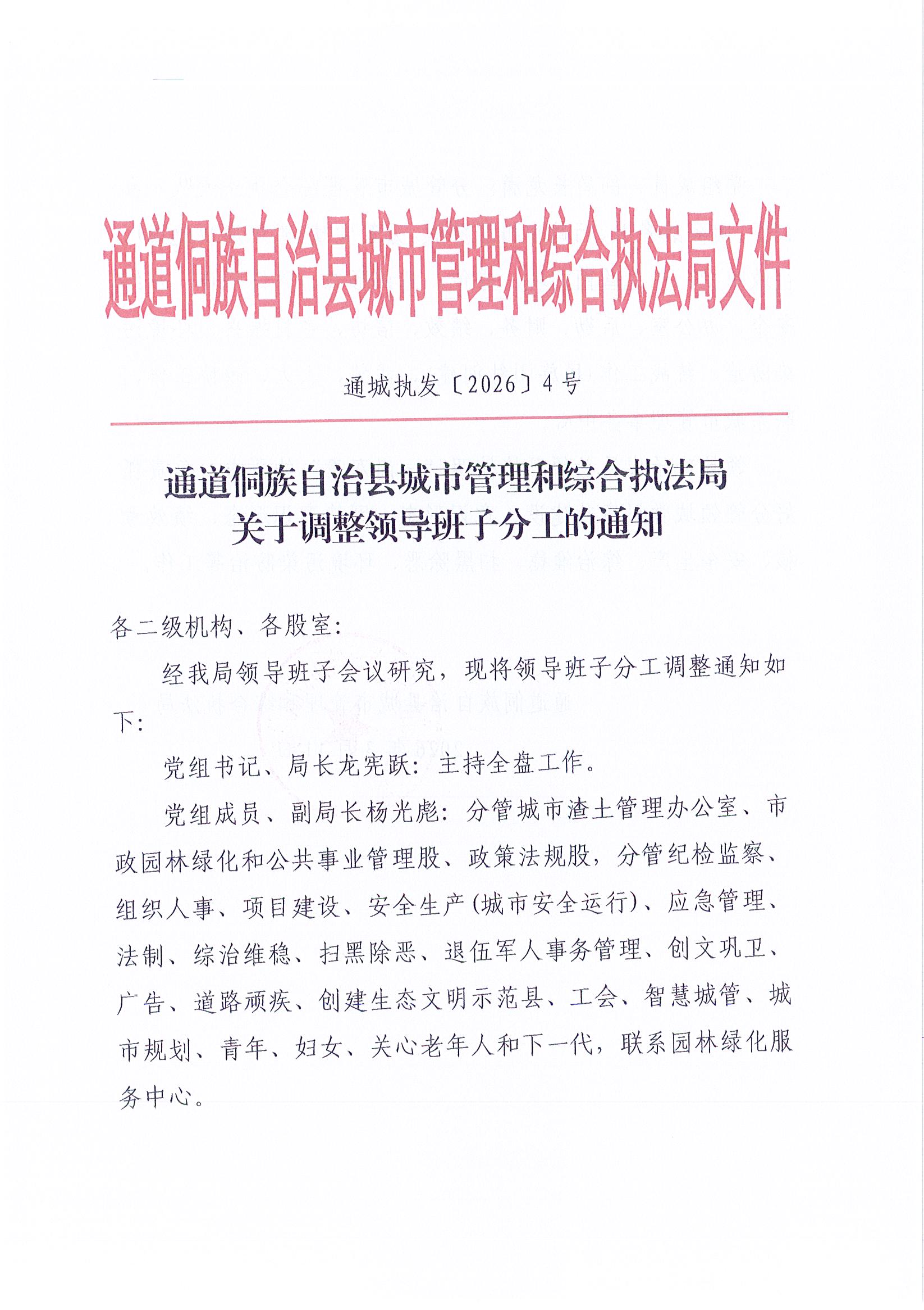 通道侗族自治县城市管理和综合执法局《关于调整领导班子分工的通知》通城执发〔2026〕4号