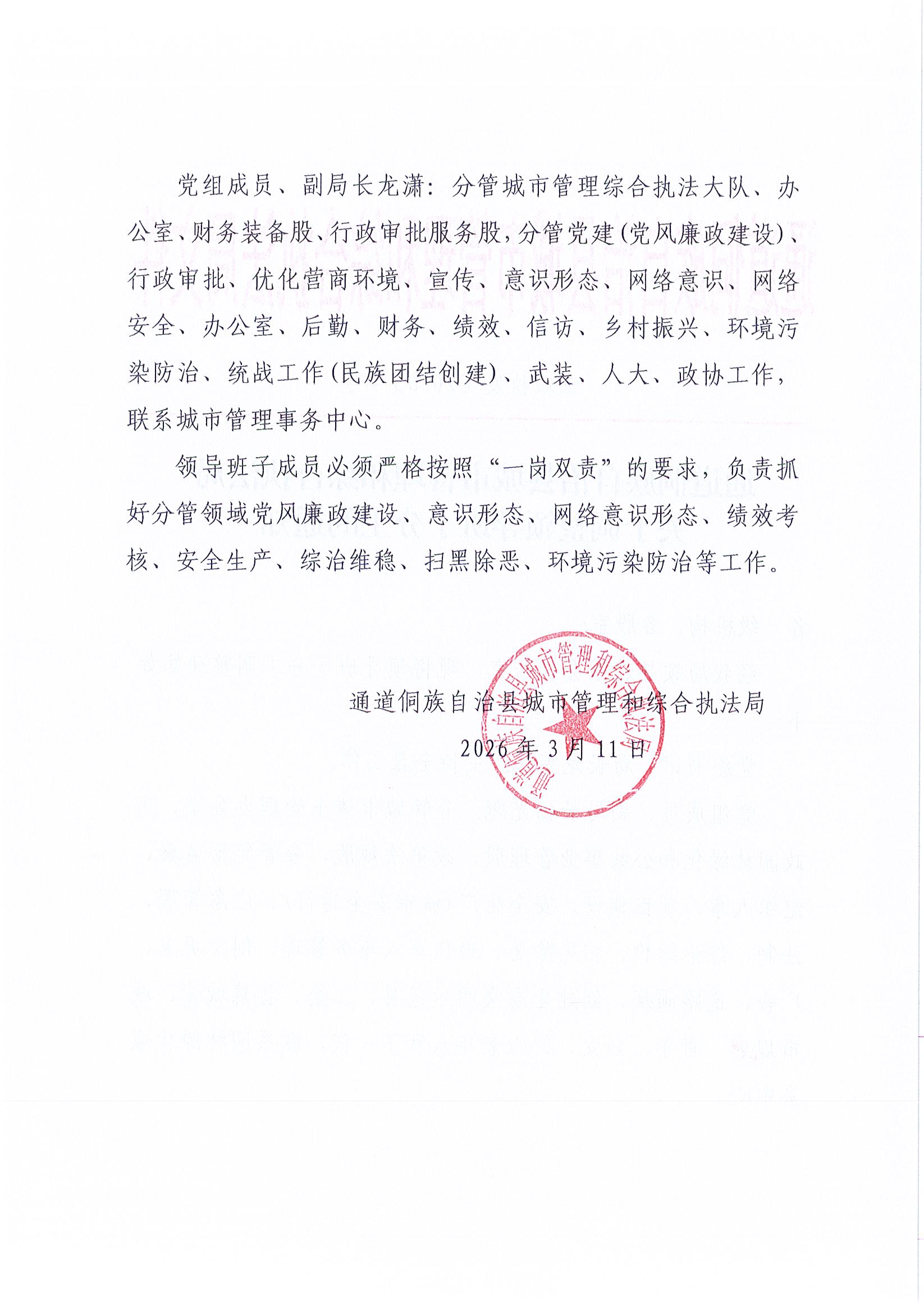 通道侗族自治县城市管理和综合执法局《关于调整领导班子分工的通知》通城执发〔2026〕4号