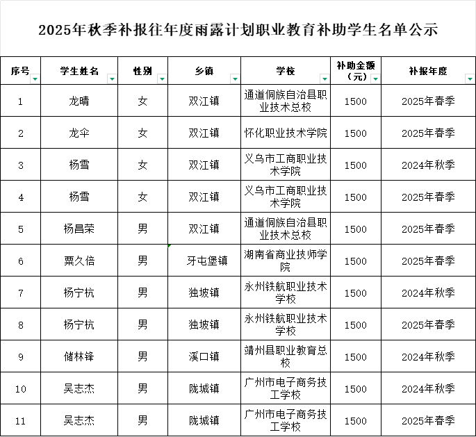 2025年秋季补报往年度雨露计划职业教育补助学生名单公示