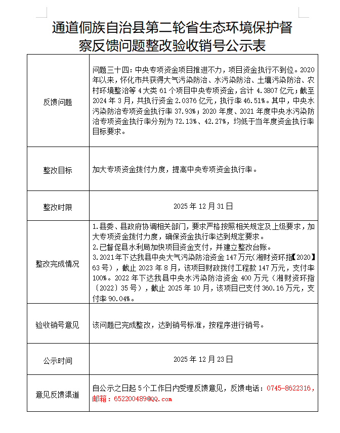 通道侗族自治县第二轮省生态环境保护督察反馈问题整改验收销号公示表