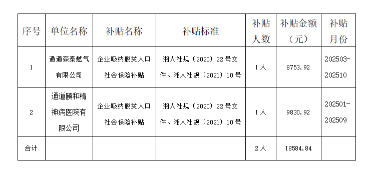 2025年通道县企业社会保险补贴名单公示(第二批)