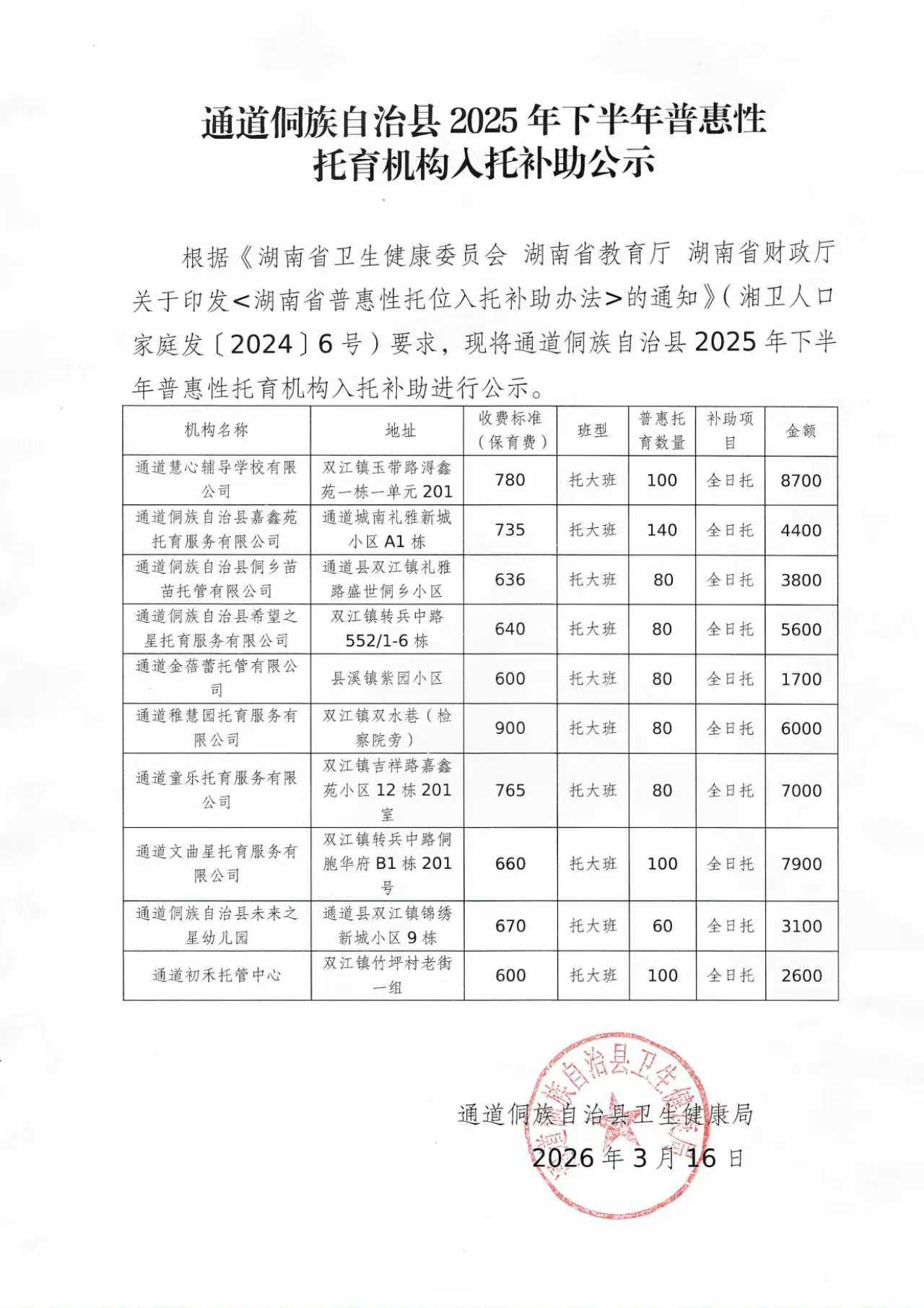 通道侗族自治县2025年下半年普惠性托育机构入托补助公示