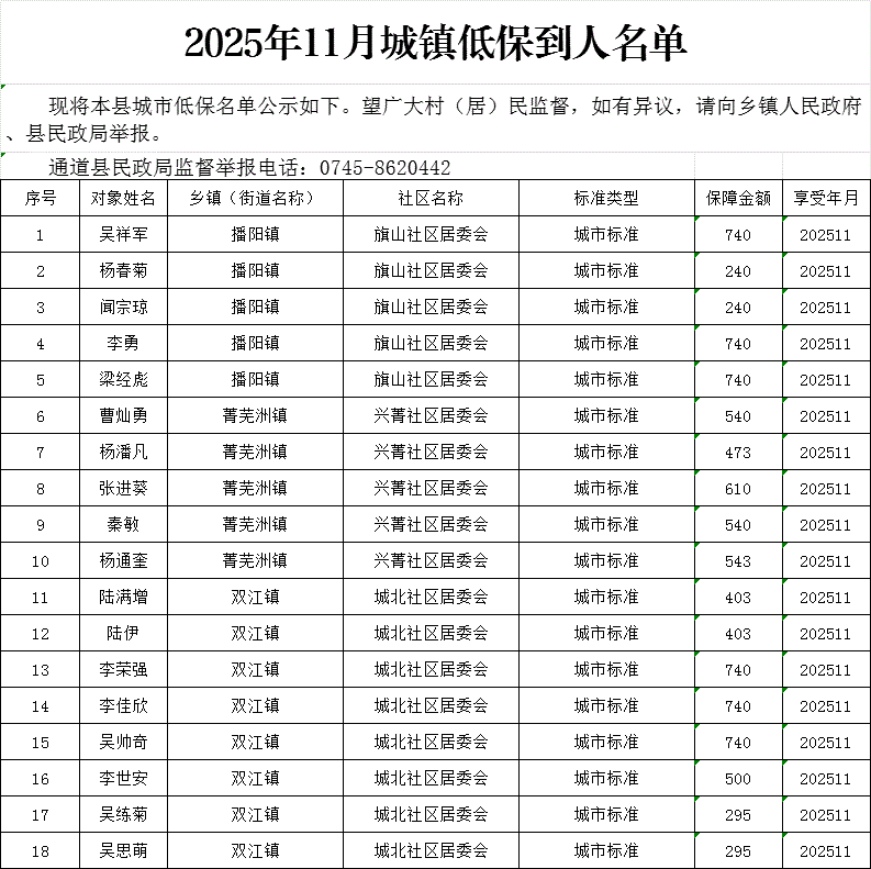 2025年11月城镇低保到人名单