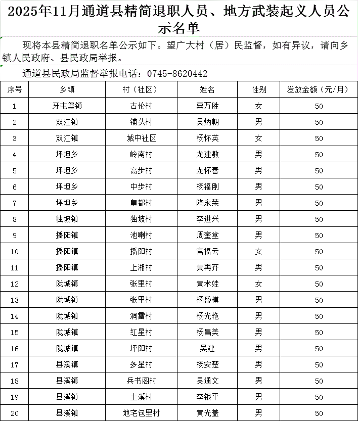 2025年11月通道县精简退职人员、地方武装起义人员公示名单