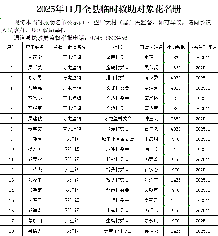 2025年11月全县临时救助到户名册