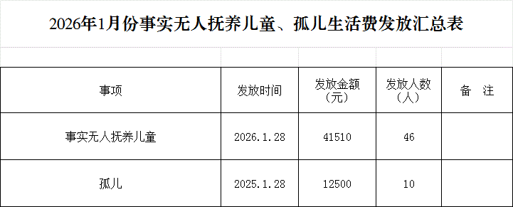 2026年1月份事实无人抚养儿童、孤儿生活费发放汇总表