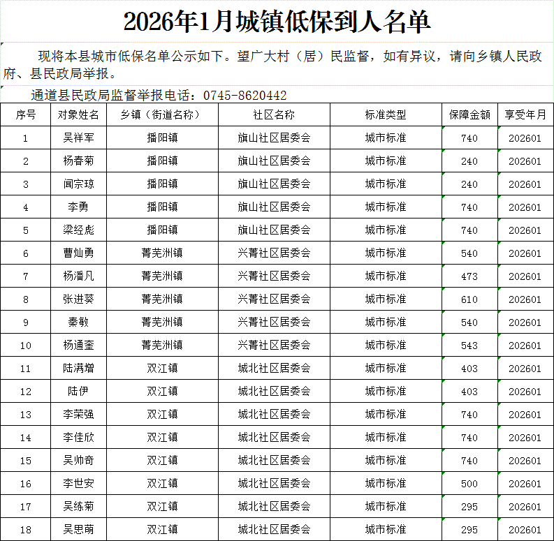 2026年1月城镇低保到人名单