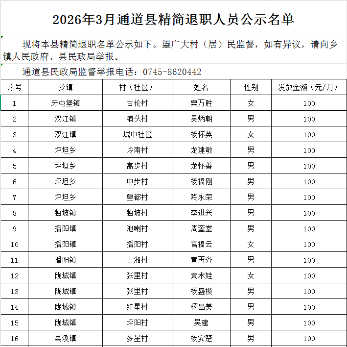 2026年3月通道县精简退职人员公示名单