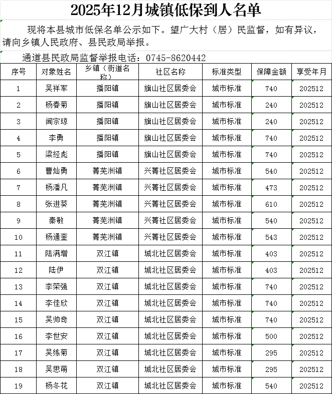 2025年12月城镇低保到人名单