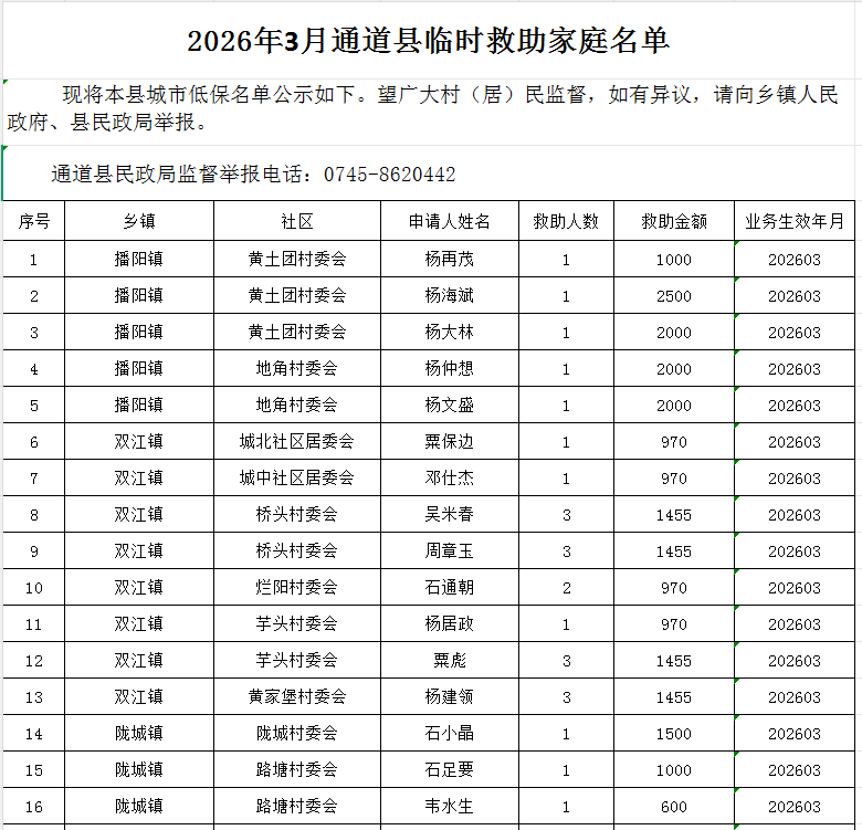 2026年3月通道县临时救助家庭名单