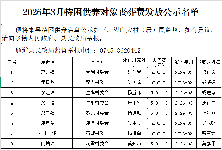2026年3月特困供养对象丧葬费发放公示名单